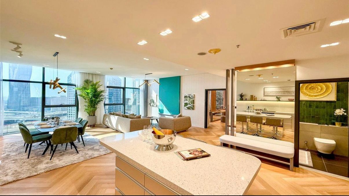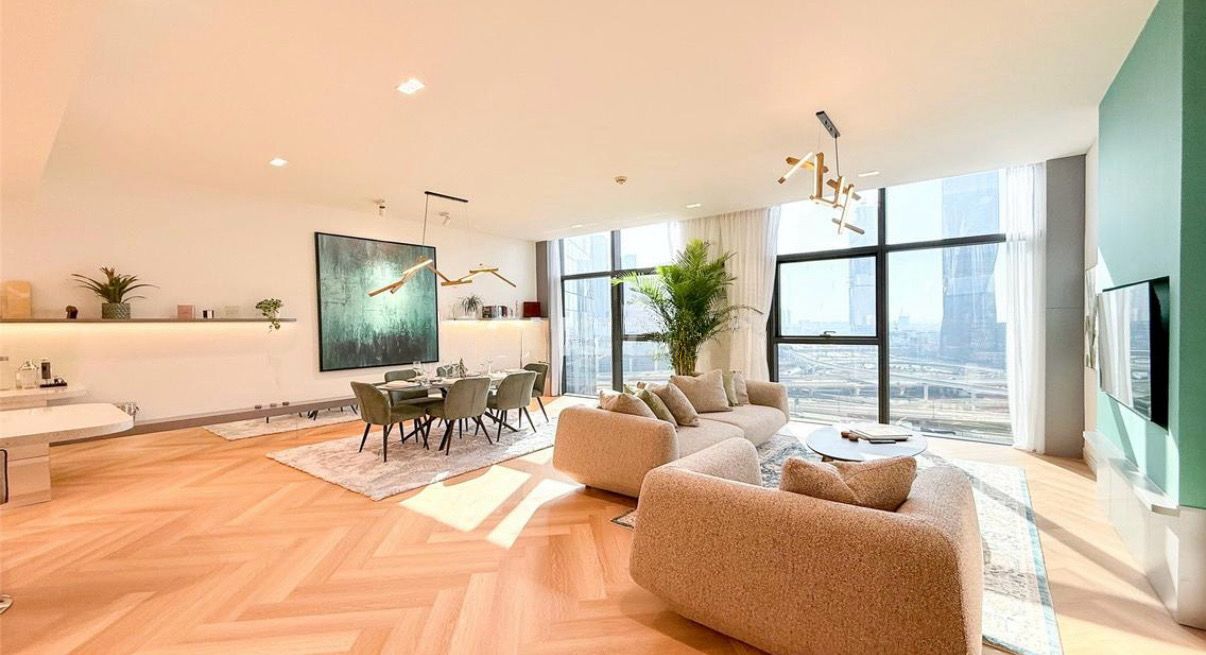 Die Wohnung ist westlich ausgerichtet und wird am Nachmittag von natürlichem Licht durchflutet. Der Blick eröffnet sich auf den Swimmingpool, die begrünten Gärten des Podiums sowie Sheikh Zayed Road, während die Lage innerhalb des Towers ein bemerkenswert ruhiges Wohnen ohne Straßenlärm ermöglicht.