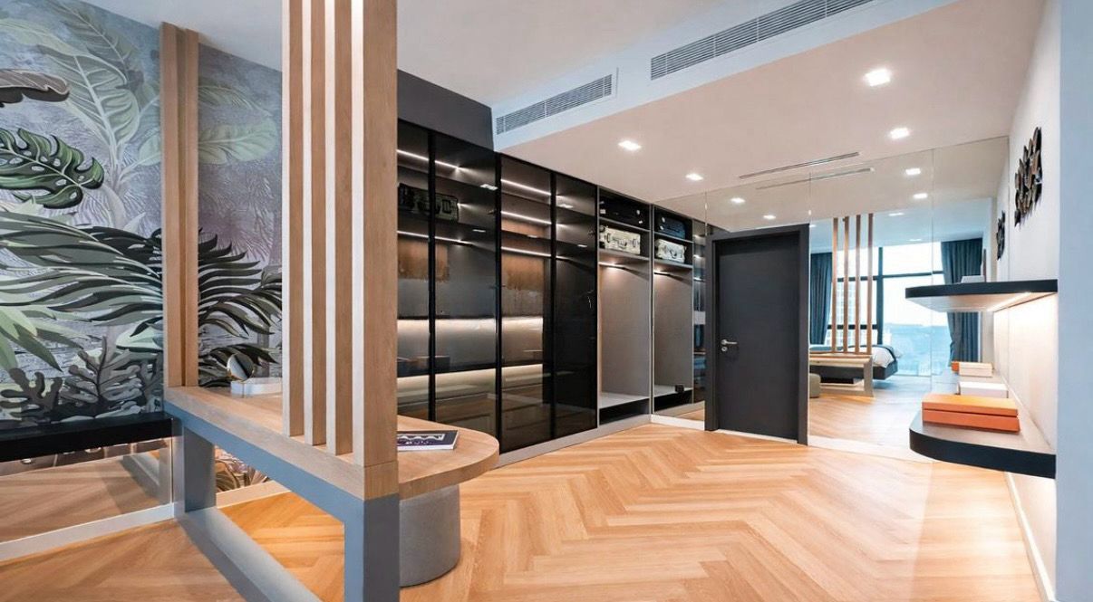 Ein dedizierter Work-from-Home-Arbeitsplatz maßgefertigte Einbauschränke mit Vanity- Bereich, integrierte Sitz- und Stauraumlösungen im Eingangsbereich, ein fest verbautes Bett, ein versteckter Pantry-Bereich, separater Laundry Room sowie durchdachte Regalsysteme schaffen ein außergewöhnlich aufgeräumtes und ruhiges Wohngefühl.