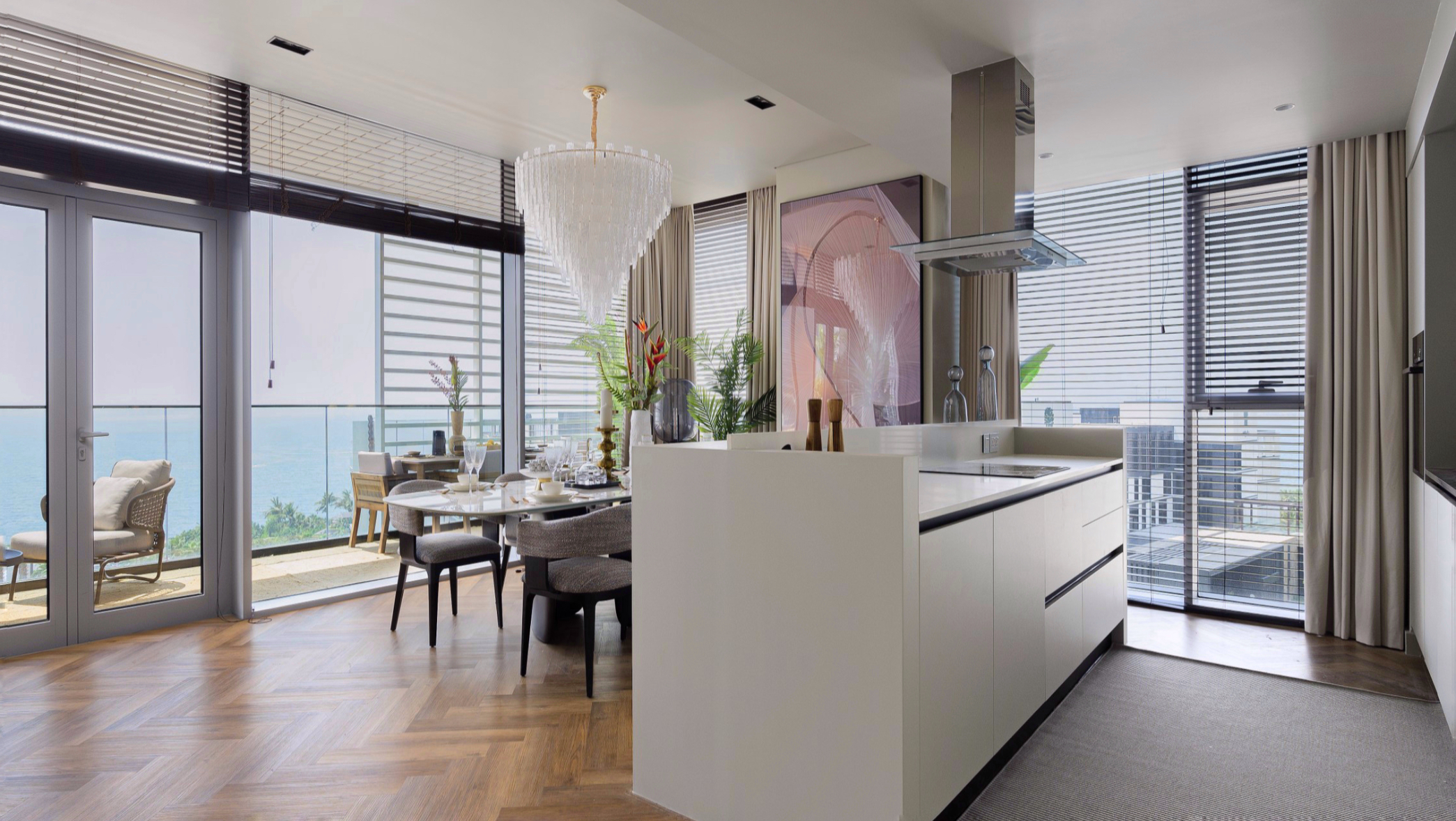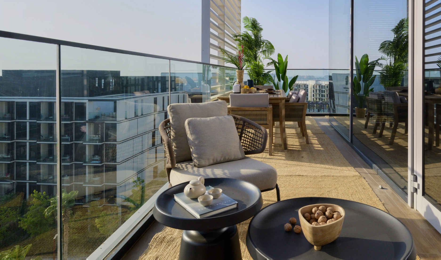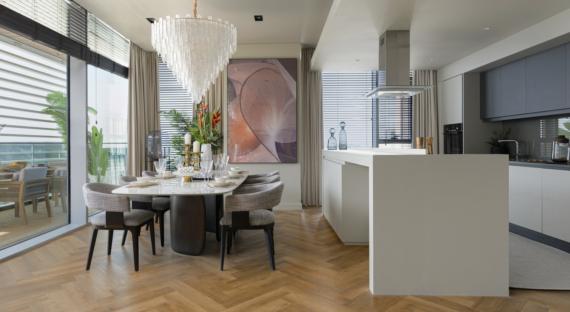 Spacious open-plan living and dining area, modern kitchen, master bedroom with en-suite, three additional bedrooms, maid’s room, multiple bathrooms, large terrace.