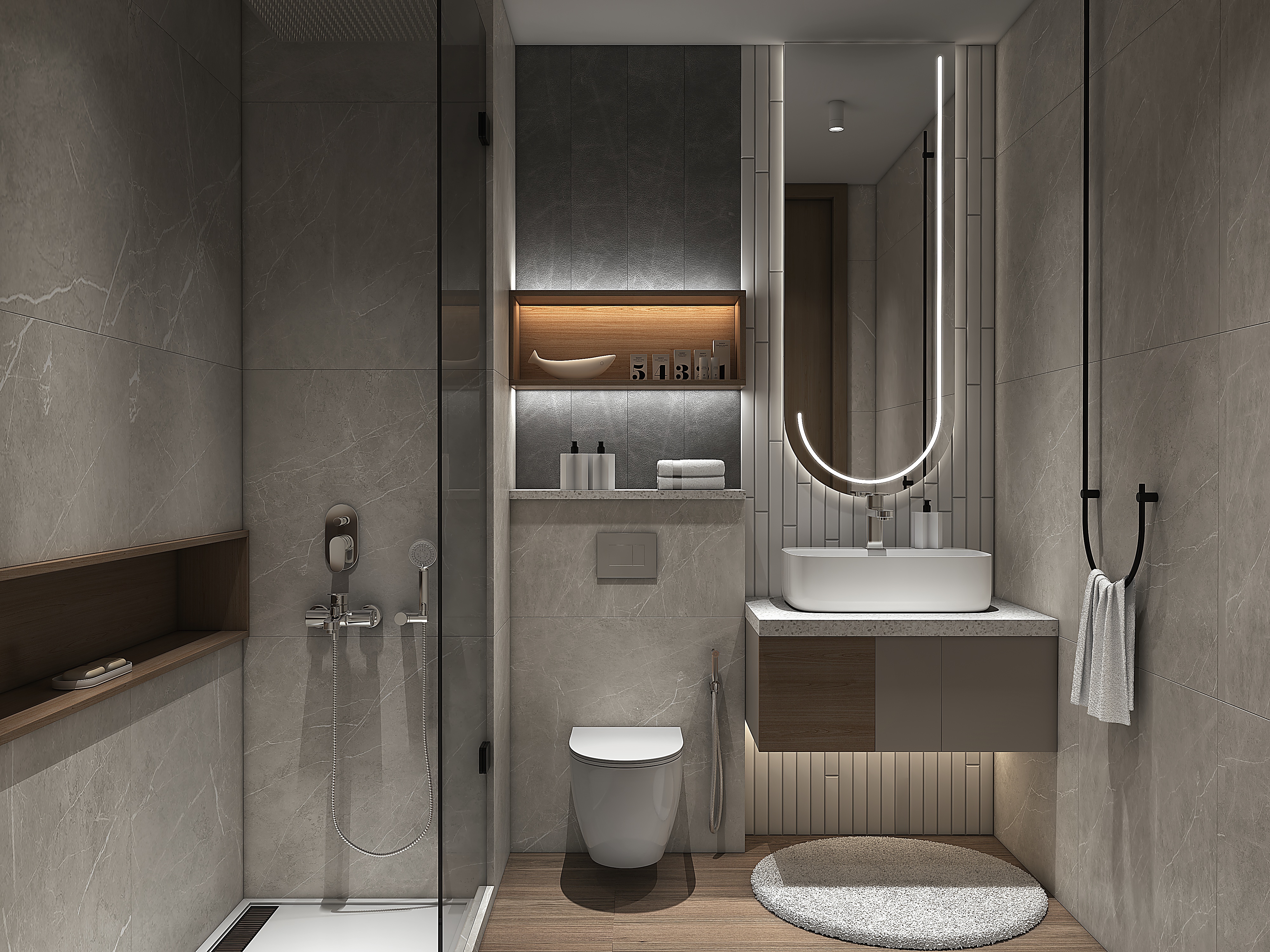 Das moderne Badezimmer ist mit einer begehbaren Dusche mit Regenduschkopf und hochwertiger Sanitärausstattung ausgestattet.